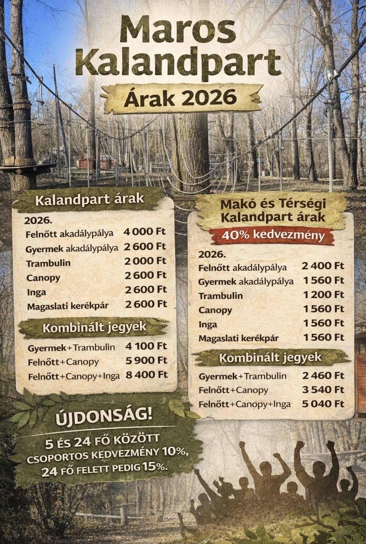 Tedd próbára ügyességed, bátorságod a 26 akadályból álló felnőtt kalandpályán. Fejleszd kitartásod és küzd le a kihívásokat.